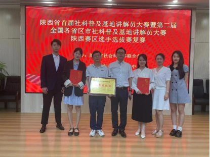 6月20日,“陕西省首届社科普及基地讲解员大赛暨第二届全国各省区市社科普及基地讲解员大赛参赛选手选拔复赛”在陕西省妇女儿童中心3楼多功能厅举行。陕西省社科联党组书记、常务副主席郭建树出席比赛开幕式并讲话,陕西省社科联党副主席高红霞、陕西省社科联科研科普部部长翟金荣、社会组织管理部部长张金高、信息部部长周晓霞、二级调研员祝志明等领导出席本次大赛并为获奖选手颁奖。我校文化传承与翻译体验馆科普基地张琬晨老师的《用英语讲好中国故事》、终南文化科普基地王佳丽老师的《送你一座终南》均获得三等奖,beat365平台唯一官网荣获“优秀组织奖”,科研处成果管理科科长李刚代表学校领奖。文学与传媒学院2021级的史佳怡和刘栩翀两位同学担任本次大赛主持人。