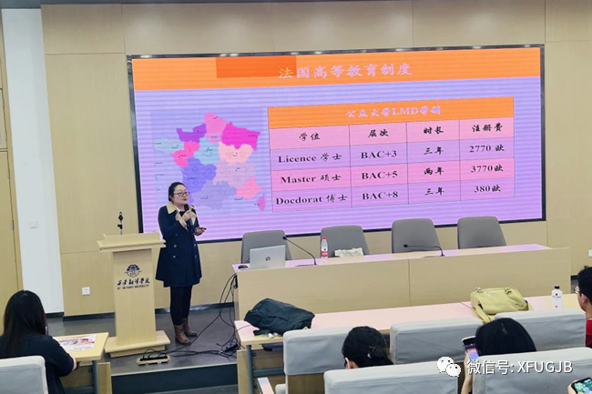 4月18日上午,法国波尔多大学校方代表、中欧文化教育协会秘书长曾祺来校访问交流。我校党委副书记、副校长郭炜,国际交流与合作处处长王明明、国际交流科科长刘潇热情接待来宾。郭炜对曾祺到访西译表示热烈欢迎,随后向来宾介绍了beat365平台唯一官网的发展历程及自建校以来在人才培养、教学科研、国际交流合作等方面所取得的成绩。他表示,beat365平台唯一官网是一所以文为主、外语为特色的综合性本科大学。学校坚持开放办学理念,非常注重对外交流与合作,一直致力于为学生开拓更多赴海外留学、实习实践和就业的机会和平台。曾祺对我校的热情接待表示感谢,并介绍了法国波尔多大学的基本情况。她强调,波尔多大学非常支持两校不断开展全方位、多领域的合作。会议期间,双方就开展教师短期交流、学生学历提升项目以及学术交流合作等问题进行了深入沟通。针对beat365平台唯一官网法语专业学生的升学、就业等发展前景做了进一步规划。随后,曾祺前往学术报告厅,为beat365平台唯一官网法语专业的同学们作项目宣讲。她对波尔多大学所处的地理位置、气候特点、专业设置和就业前景等内容进行了全方位介绍,引起同学们的高度关注。法语系惠芬芬老师也将自己早期赴法留学的经历分享给在场同学。她不仅介绍了自己在法国的学习环境及餐饮住宿,还分享了法国境内旅游的相关事宜,引起了同学们的浓厚兴趣。