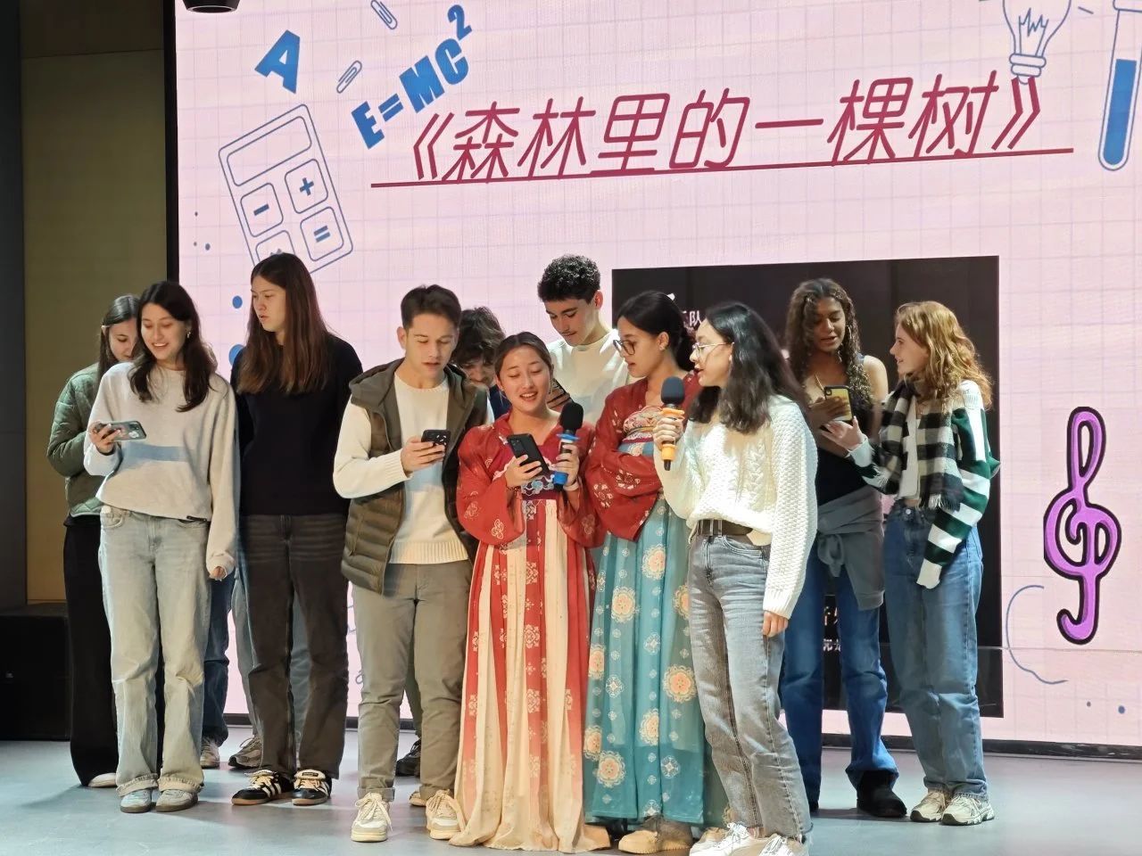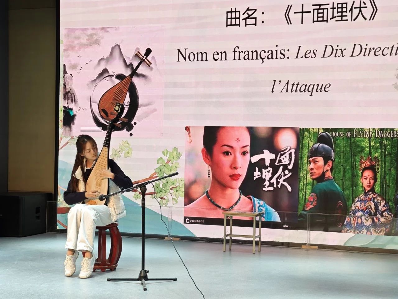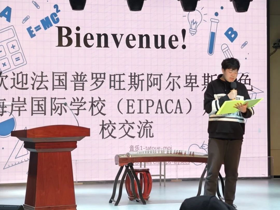 随后,中国乐器表演以古筝《雪山春晓》的悠扬旋律开场,琵琶《十面埋伏》的气势磅礴紧随其后,二胡与琵琶合奏的《茉莉花》更是令人陶醉,让法国学生深刻感受到了中国传统乐器的独特魅力。法语系学生焦颖馨演唱的《青花瓷》旋律优美,如同一幅动人的画卷;法国学生则通过中国舞、城市介绍和合唱《森林里的一棵树》展现了他们对中国文化的热爱。法语系学生周锦荣演唱的法语歌曲《si on disait》展现了我系学生对法语歌曲的热爱;刘宸赫领唱的《Les Champs-Elysées》将活动氛围推向高潮。