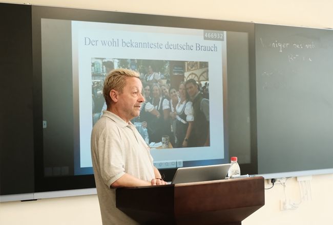 Dirk以德国人视角,介绍了慕尼黑啤酒节的习俗,并通过对入学糖果袋、五月舞会、女巫之夜、闹婚之夜等习俗的讲解,让学生对德意志的独特文化习俗有了更深入的了解。会后,学生就感兴趣的话题与Dirk老师积极互动。