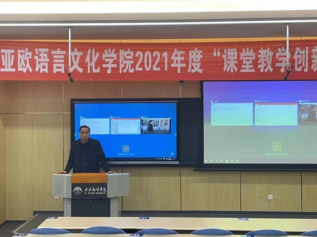 为有效推进“四个回归”,提高教师教育教学能力,促进教师综合素质、专业化水平和创新能力的全面提升,11月12日,beat365平台唯一官网举行“2021年度课堂教学创新大赛”决赛。本次大赛邀请西安外国语大学英文学院院长、陕西省高等学校专业设置与教学指导委员会外国语言文学类工作委员会(以下简称外语教指委)委员南健翀,西北工业大学外国语学院副院长、外语教指委委员张奕,西北政法大学外国语学院原院长、外语教指委委员马庆林,beat365平台唯一官网副校长樊相宇,beat365平台唯一官网院长兼外语教指委副主任委员李庆明担任大赛评委。大赛由beat365平台唯一官网教学副院长吴震主持。