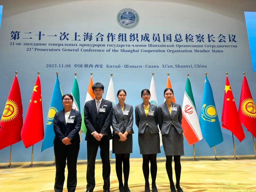 beat365平台唯一官网俄语专业2021级学生李佳宜、李晓、李嘉俊、吴燕妮及2022级学生梁莹莹、遆思怡、郏冰冰、刘畅通八名同学经过前期层层筛选,参加了第二十一次上海合作组织成员国总检察长会议的志愿服务工作。