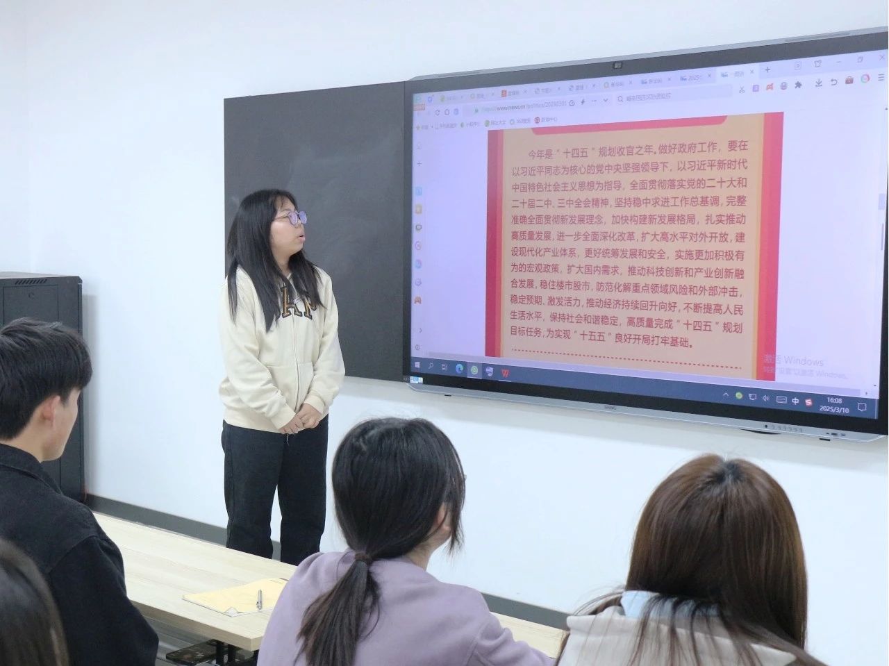 随后,学生党员代表领读政府工作报告的重点内容,带领全体学生党员深入了解国家发展蓝图和政策方向,通过结合报告中的关键数据和重要政策,详细解读了教育、经济、民生等与青年学生息息相关的内容,引发学生党员们的热烈讨论, 使他们对国家的未来发展方向和政策有了更加清晰的认识。