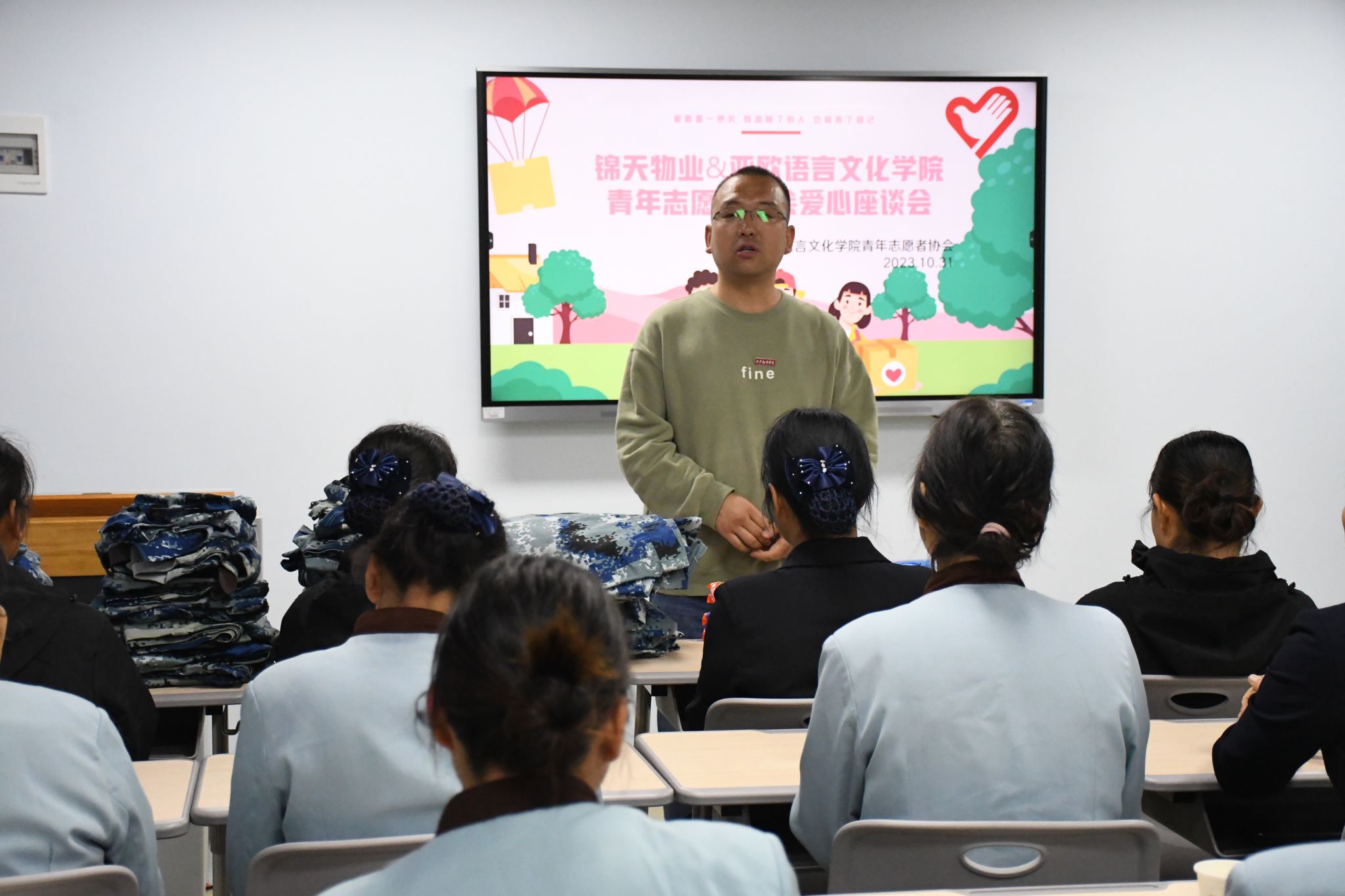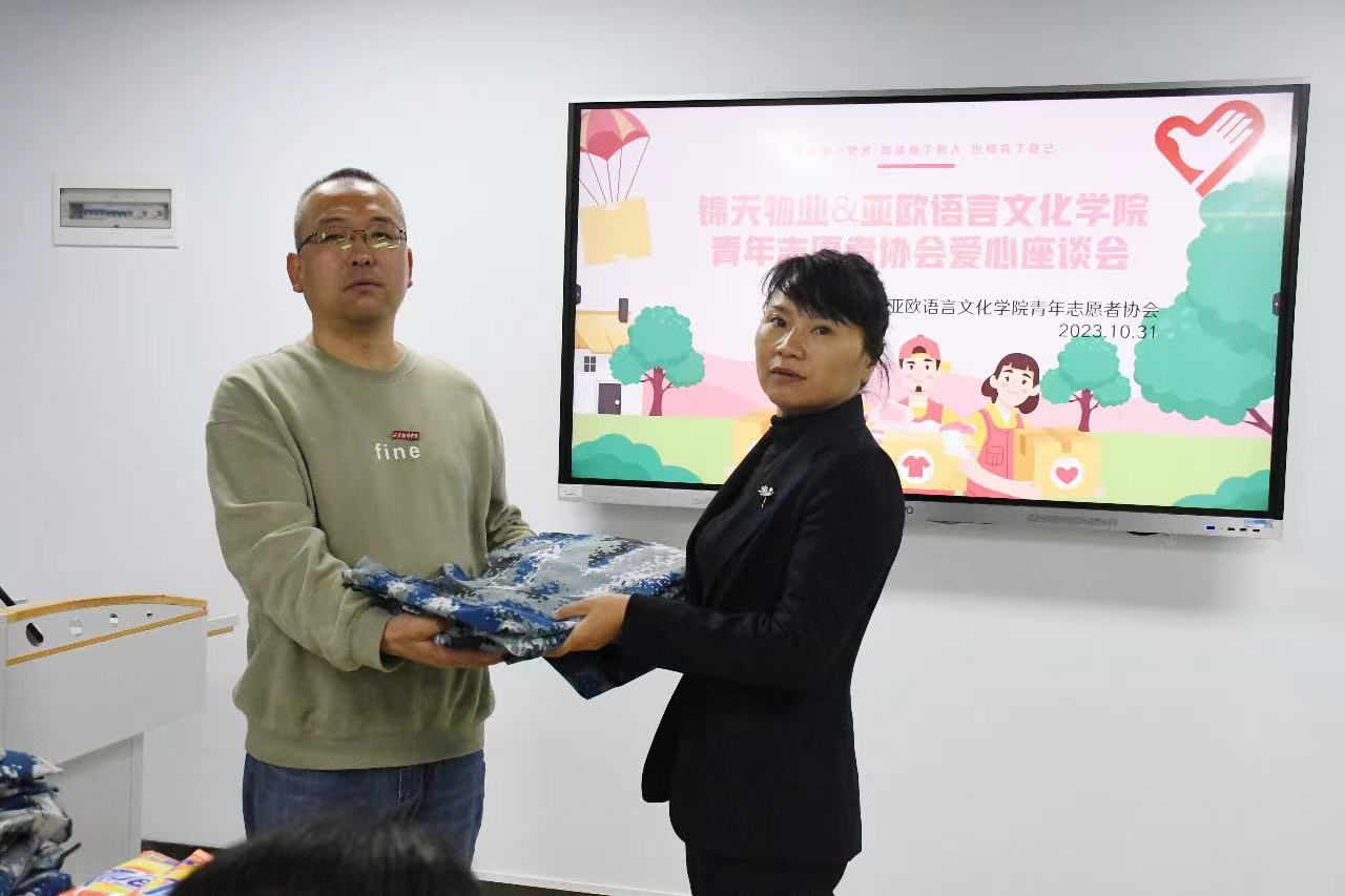 陈福礼表示,非常感谢锦天物业各位保洁阿姨的辛勤付出,为大家创造了整洁优美的学习、工作和生活环境,但这种美丽的环境需要每一位学生将之保持,从自身做起,为建设美丽西译共同努力。同时,他也希望同学们能够了解到劳动的价值和意义,增强自我管理和组织协调能力,感受到自己作为一名公民应该承担的社会责任,提高社会责任感和使命感。为表达感谢,学院青年志愿者协会组织了捐赠军训服的活动,将同学们的这份爱和温暖,传递在每一位保洁阿姨的手中。