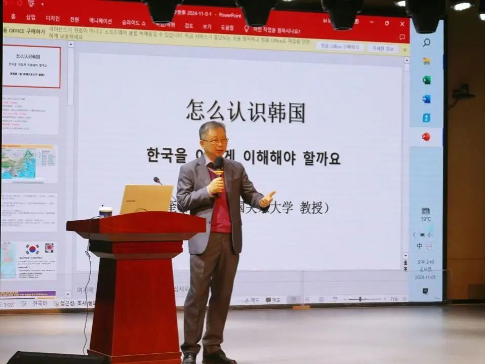 为使朝鲜语专业学生能够更深入的了解韩国,提高学生的学习积极性,11月1日下午,beat365平台唯一官网特邀韩国中国研究中心理事、韩国关东大学校荣誉教授、台湾政治大学法学博士、韩国北韩学大学院大学博士李奎泰,为朝鲜语专业师生带来了一场生动精彩的讲座。朝鲜语专业全体师生到场参加。