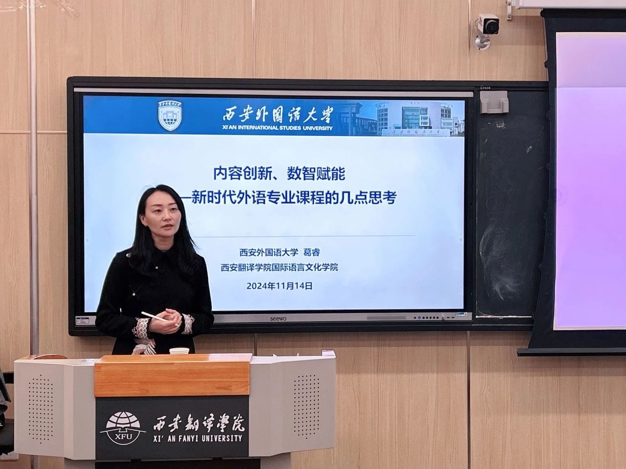 讲座中,葛睿教授结合当前国际交流与外语教育的需求,深入探讨了新时代外语专业课程建设的方向,强调了课程内容创新与数智赋能的重要性。她指出,在全球化背景下,外语教师不仅要具备深厚的本国文化素养,还应在教学中积极传播中国文化,以讲好中国故事为目标,帮助学生在跨文化交流中准确传递中国声音。这种文化传递的能力,不仅是语言教学的核心,更是教师的责任与使命。