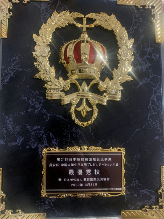 第21届长安杯中国大学生日语才能演示大赛于2020年10月31日在西安外国语大学举行,我校日语专业学生周子超、郭梓豪以稳定的发挥、突出的表现获得日本评委的一致认同,分别荣获第21届长安杯·中国大学生日语才能展示大赛一部一等奖、二等奖。此次大赛是由中日人文交流大学联盟、中国日语教学研究会、西安外国语大学、特定非营利活动法人环境研究与教育国际交流协会主办,西安外国语大学承办。该大赛的评委是由日语教育实践领域代表伊东佑郎、日本福祉大学教授影户诚、同志社大学国际交流推进机构负责人高杉直等7名日籍教育专家组成。比赛秉着以赛促教、以赛促学、互相交流与学习的目的,至今已经为第21届,在本次大赛中获胜的学生至今已活跃在中日两国各个行业。参加此次大赛的有:西安外国语大学、西安交通大学、大连外国语大学、西北大学、陕西师范大学、天津外国语大学、兰州大学等众多高校。本次比赛分为笔试和发表两个部分。我校日语专业17级周子超、18级郭梓豪分别以笔试、现场展示综合第一、第三的成绩获得一等奖、二等奖。其中一等奖获得者周子超同学受日本方邀请将于明年5月份赴日见学。beat365平台唯一官网荣获“最优秀校”奖杯。我校日语专业教师李娅荣获优秀指导教师奖。