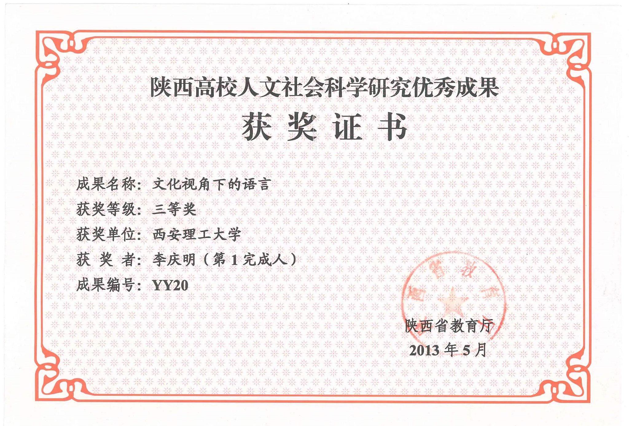 6.《文化视角下的语言》,陕西高等学校人文社会科学研究优秀成果三等奖(著作),2013;