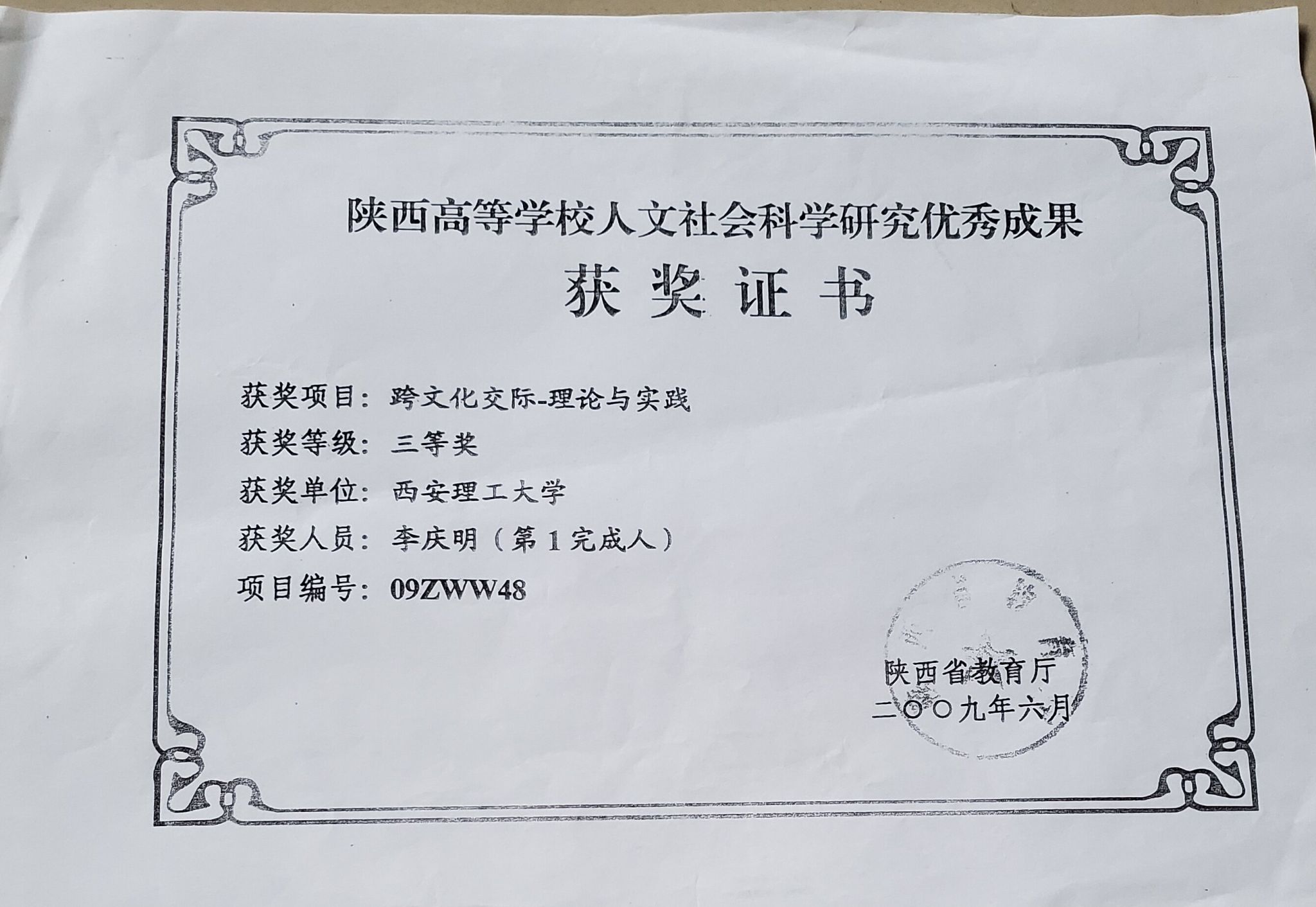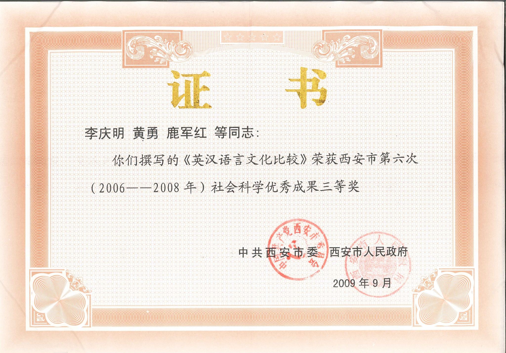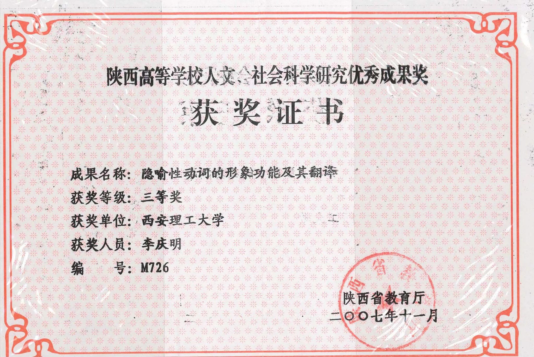 11.《英汉语言文化比较》,西安市哲学社会科学研究成果三等奖(著作),2009年。
