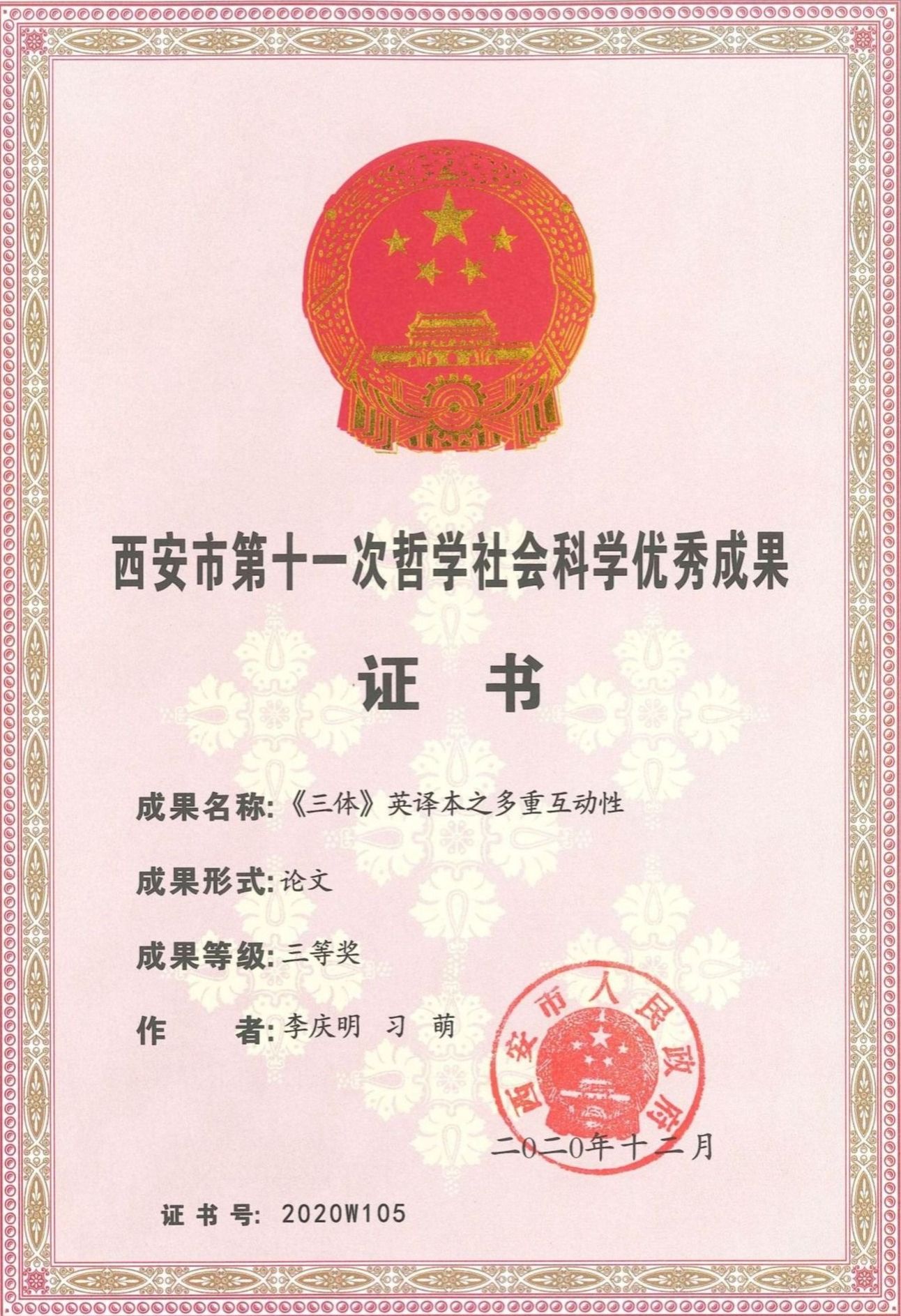 9.《三体》英译本之多重互动性,西安市哲学社会科学优秀成果三等奖(论文),2020;