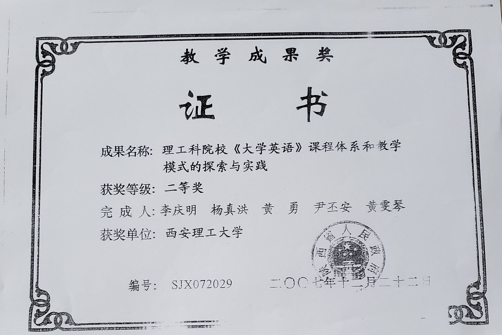 2.理工科院校《大学英语》课程体系和教学模式的探索与实践,陕西省教学成果奖二等奖,主持人,2007;