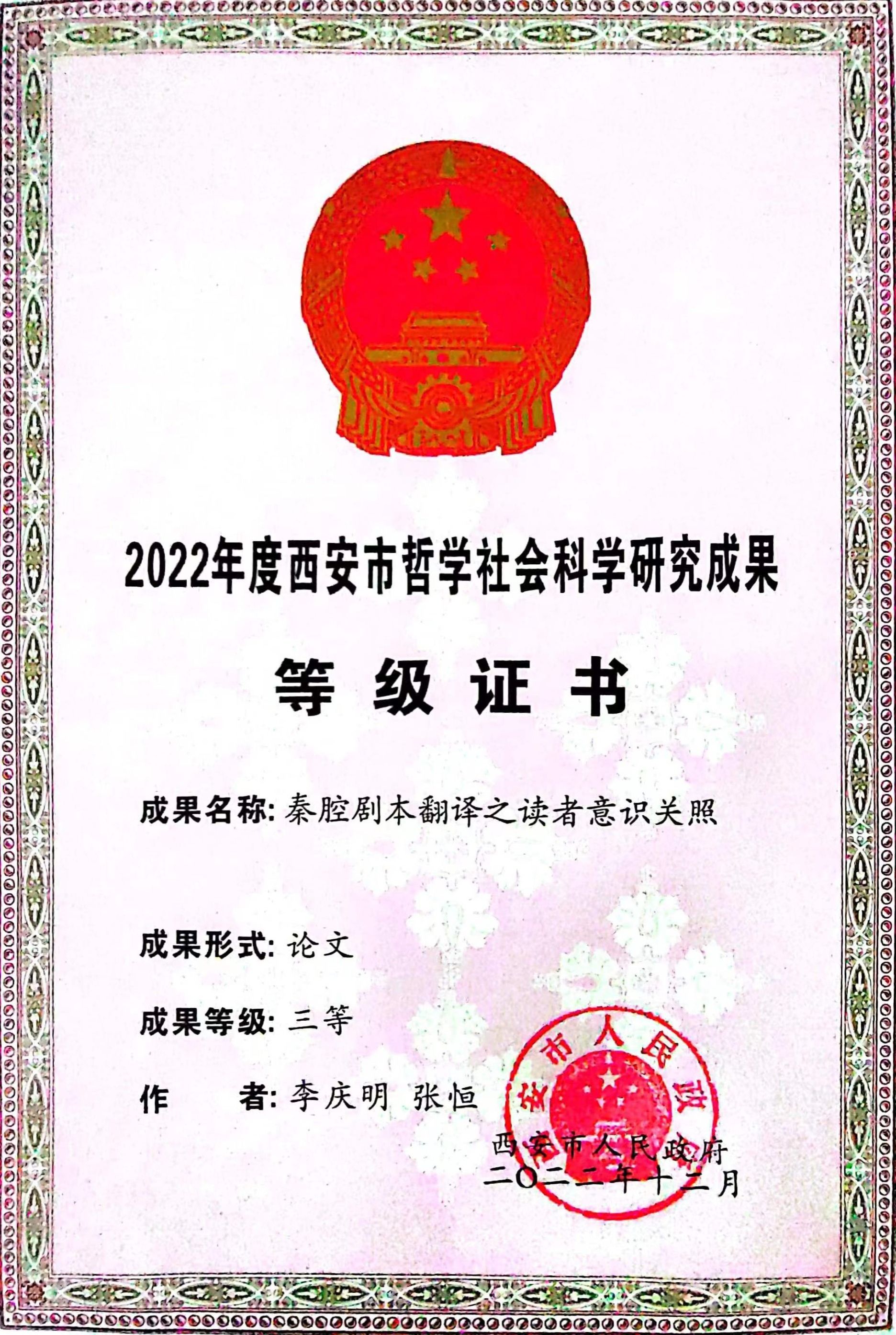 10.秦腔剧本翻译之读者意识关照,西安市哲学社会科学研究成果三等奖(论文),2022年;